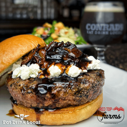 red top farms • goat cheese • bacon balsamic reduction • caramelized onions • brioche buns